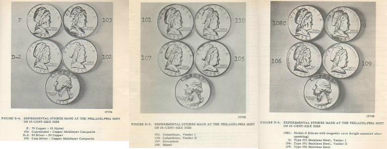 In addition to the cupro-nickel clad examples listed above, these were struck in additional alloys as shown below which were taken from the "Final Report on a Study of Alloys Suitable for Use as United States Coinage to U.S. Department of the Treasury Bureau of the Mint February 12, 1965" by Batelle Memorial Institute: